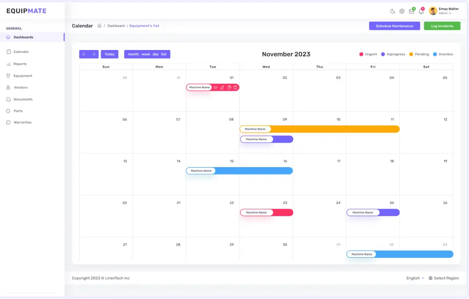 Schedule, assign, manage and track recurring or one-off maintenance tasks via EquipMate's calendar view. Trigger automatic reminder notifications to assigned technicians as scheduled dates approach.